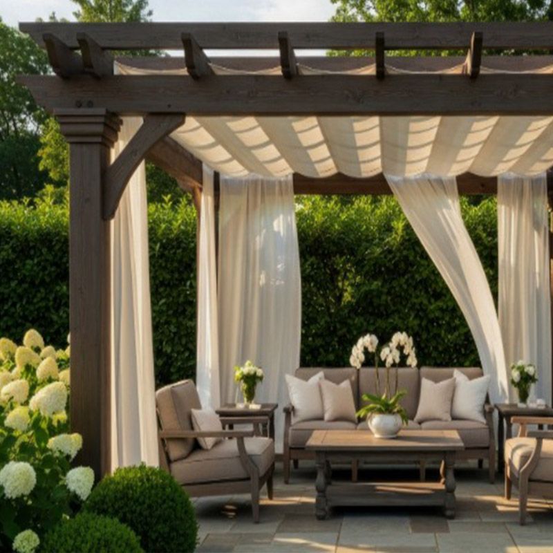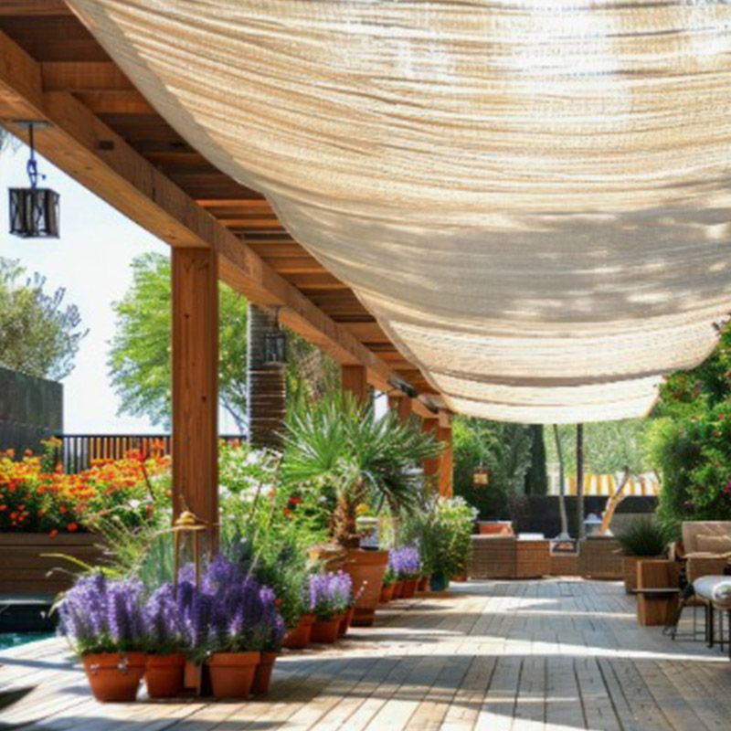 Añade un toque especial a tus eventos con nuestras pérgolas y decoraciones con telas entrelazadas.